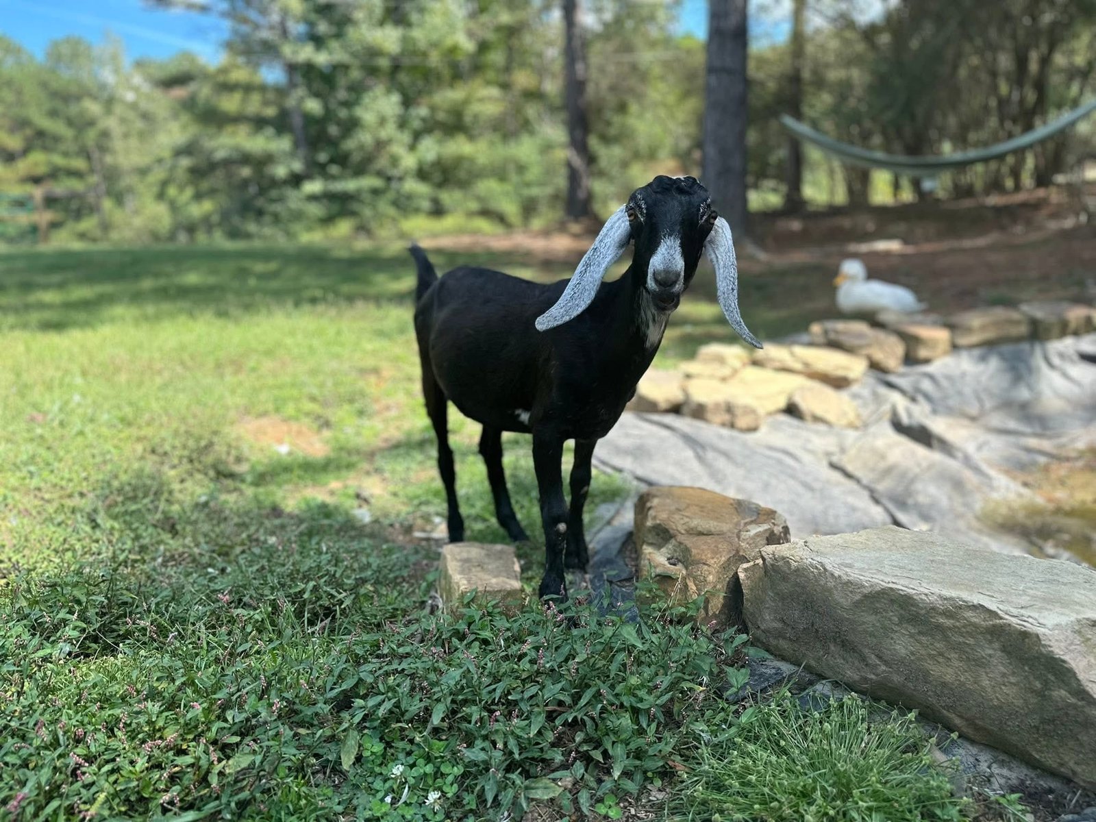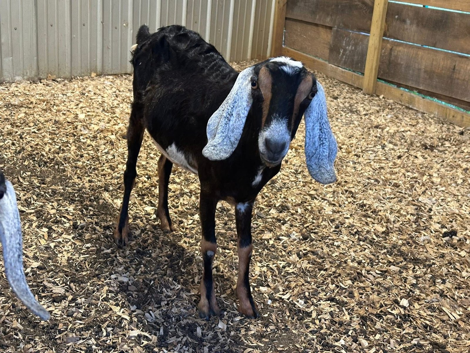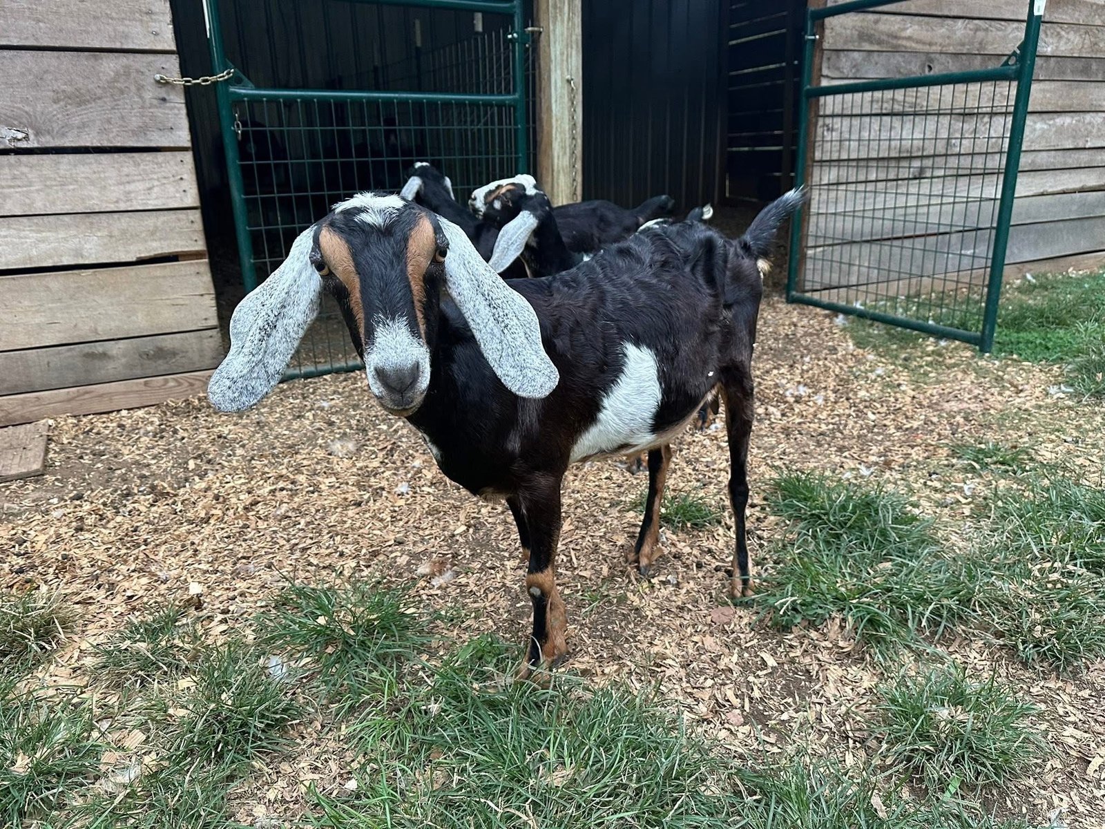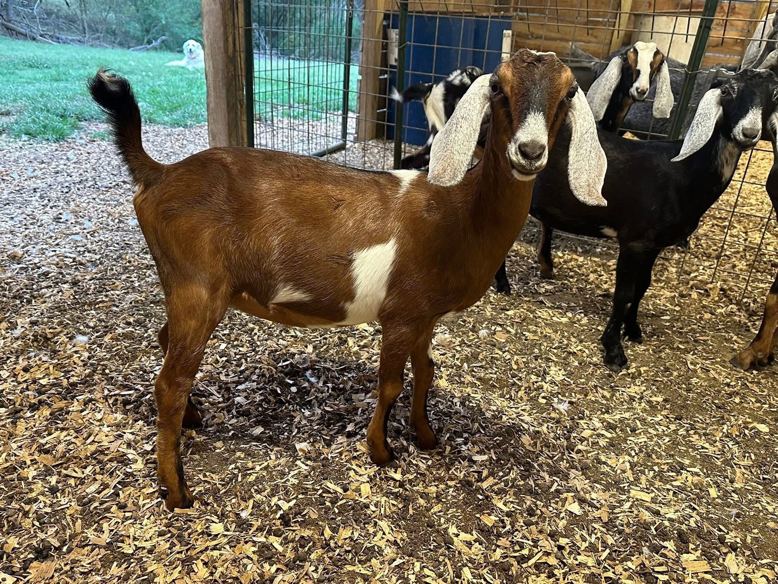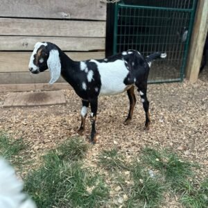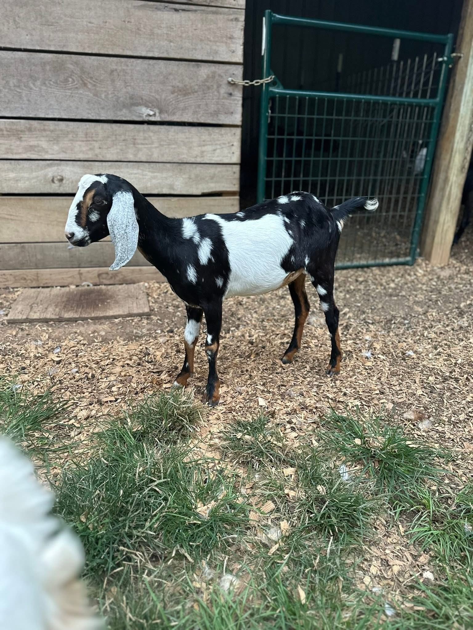 Lots of color! Eye-catching moonspots and sweet disposition. Would be a standout in any herd. Dam raised, mama is the black doe.